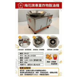 編號:PH-37 尺寸:38 x 28 x 37公分 重量:19公斤 電壓:110V / 220V 馬力:60w 內桶尺寸:直徑20 X 高14公分 用途:炸物類 脫油專用 請注意:此機台主要以炸物類脫油專用 *若欲脫油其他物品請來電洽詢,告知脫物及尺寸大小,判斷是否適用